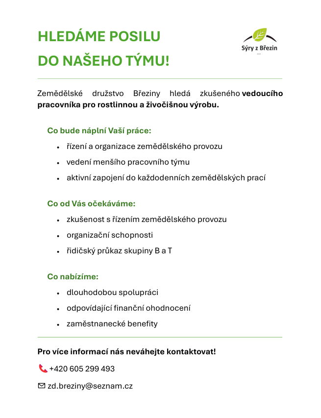 Zemědělské družstvo Březiny samostatně hospodaří od roku 1993. Fungujeme spíše jako rodinná farma, zaměstnáváme průměrně 7-8 osob. Hospodaříme na cca 160 ha půdy a chováme 200 ks hovězího skotu převážně na pastvinách.